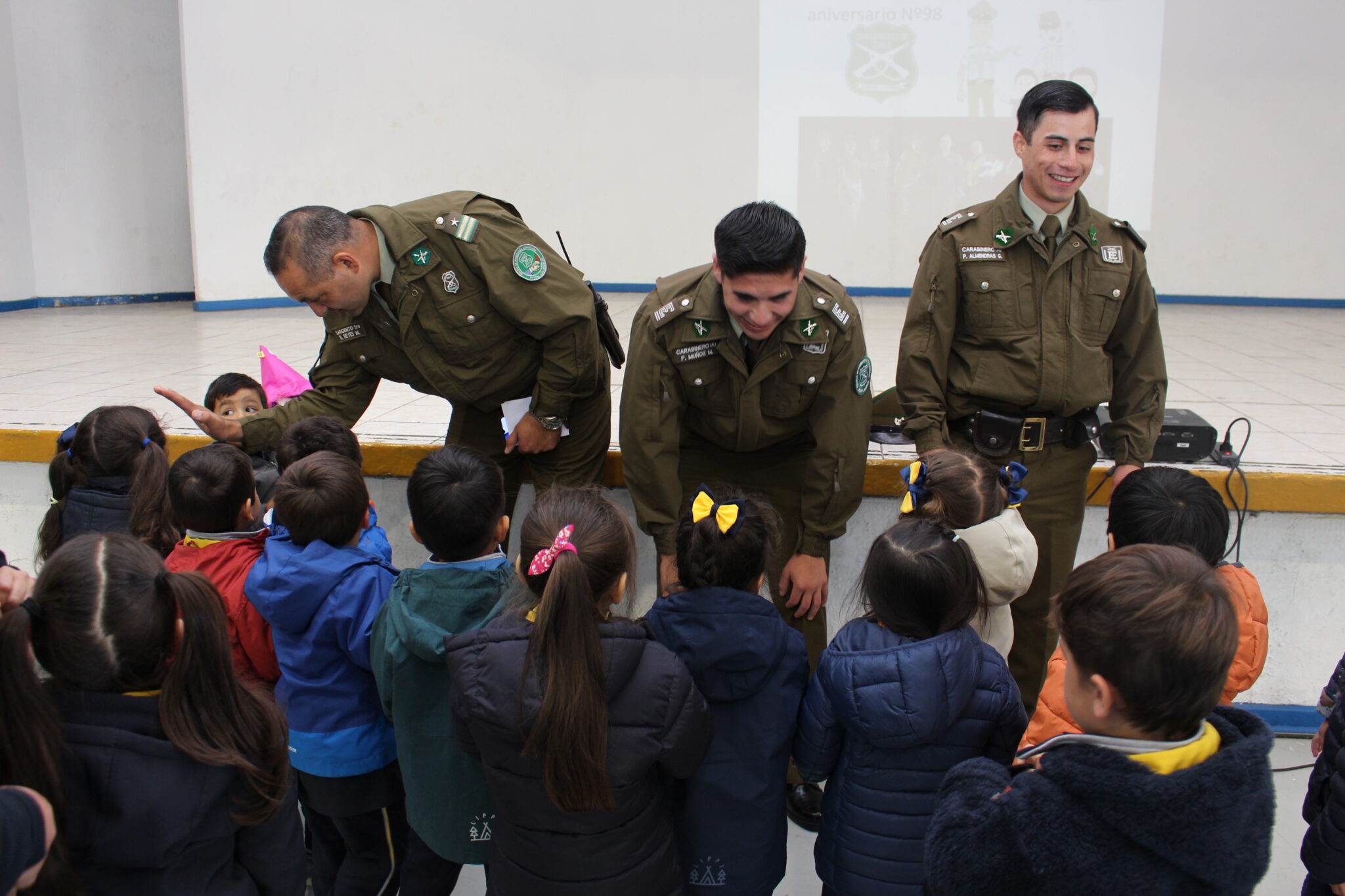 En esta ocasión, y en representación de tan noble institución, nos visitaron el sargento primero don Ricardo Reyes Márquez y los carabineros don Pedro Muñoz Moncada y don Patricio Almendras Guzmán, quienes fueron recibidos en nuestro establecimiento por el rector, don Heraldo Barriga Valenzuela, junto a docentes y estudiantes.