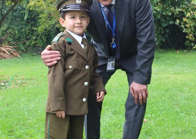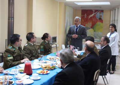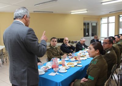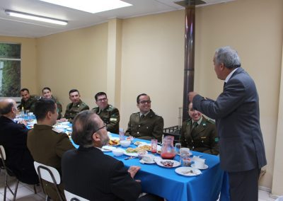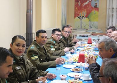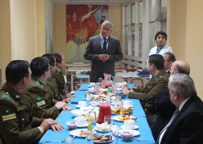 Como una forma de estrechar más los lazos con el Cuerpo de Carabineros de Chile, este año nuestro Colegio llevó a cabo una ceremonia de carácter más privada que con algunos de sus miembros, particularmente con aquellos funcionarios de esta institución que forman parte de nuestra unidad educativa en calidad de padres y apoderados. Fue así como pasadas las diez de la mañana, éstos fueron recibidos por las máximas autoridades del Colegio, presididas por don Fermín Roa Vallejos y don Luís Iturrieta Burboa, presidente y vicepresidente de la Corporación y todo el cuerpo directivo encabezado por el director, don Heraldo Barriga Valenzuela, todos los cuales pudieron disfrutar de un desayuno que contribuyó a afianzar los lazos que unen a ambas instituciones en su labor social.