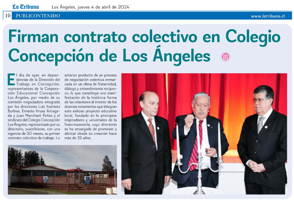 El día de ayer, en dependencias de la Dirección del Trabajo en Concepción, representantes de la Corporación Educacional Concepción Los Ángeles, por medio de su comisión negociadora integrada por los directores Luis Iturrieta Burboa, Ernesto Kruse Arriagada y Juan Marchant Peñas y el sindicato del Colegio Concepción Los Ángeles, representado por su directorio, suscribieron, con una vigencia de 30 meses, su primer contrato colectivo de trabajo.