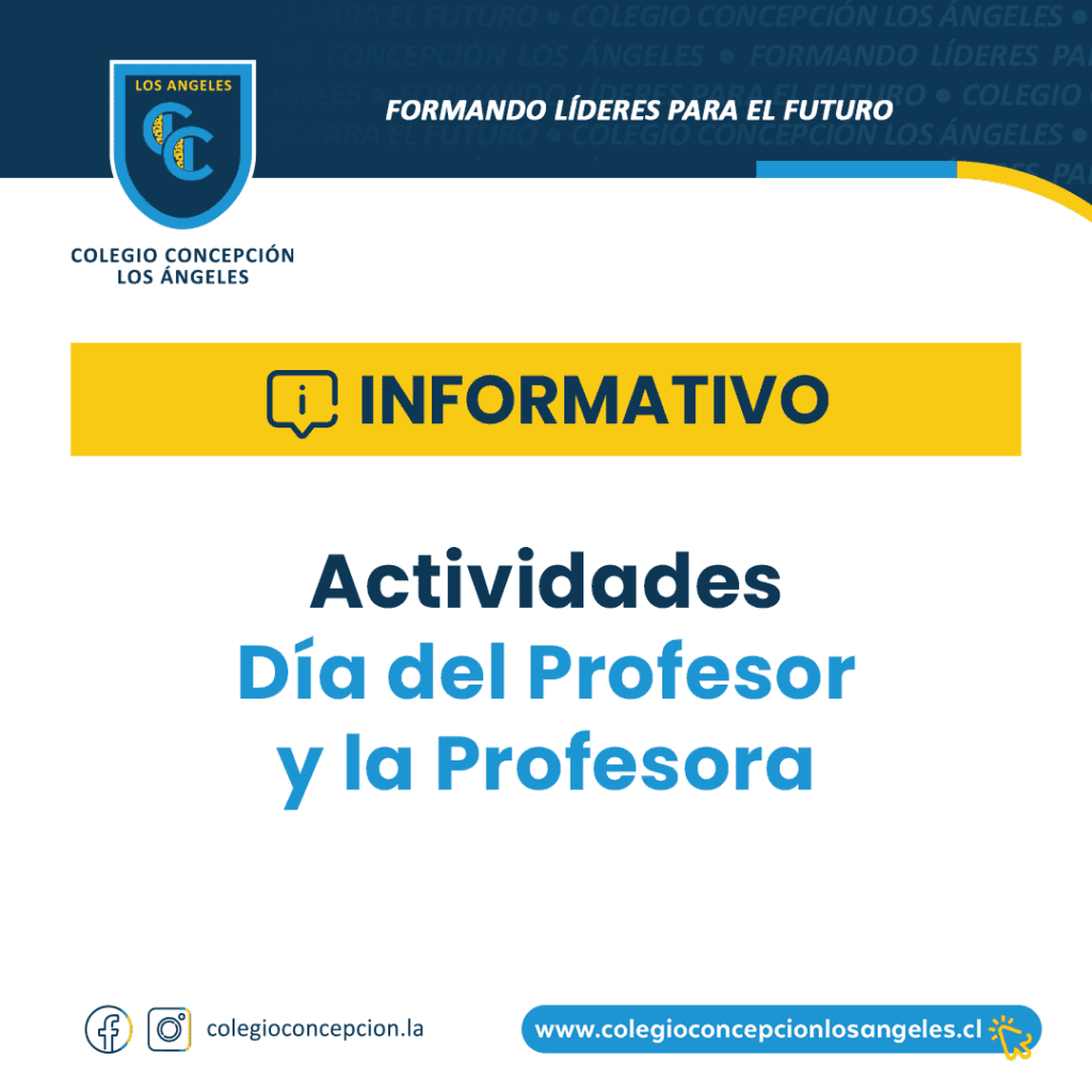 Con motivo de celebrar EL DIA DEL PROFESOR Y LA PROFESORA el próximo lunes 16 de octubre, tenemos el deber de informar a la comunidad de padres y apoderados de nuestro establecimiento que, el primer bloque de clases será normal, luego en el recreo de las 9:45 Hrs. el Centro de Alumnos ofrecerá un coctel a los docentes del Colegio Concepción.