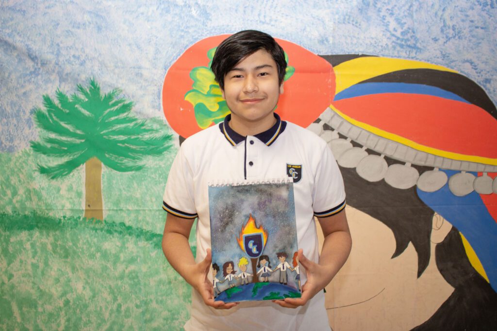 Sergio es integrante del octavo año básico “B” y saltó a la “fama” tras haber ganado el concurso organizado el año pasado para crear la portada de nuestra Anuario Bienal 2020-2021, una obra que, sin duda, fue del agrado de una gran parte de sus compañeros, padres y apoderados, que vieron en ella, no solo una pintura, sino también un interesante y emotivo mensaje de unidad: “los niños estudiantes están en el universo porque simboliza que nuestros sueños no tienen límites y que podemos lograr todas las metas que nos propongamos, mientras el colegio está en el centro junto a su insignia. Lo representé mediante una llama de fuego que simboliza el sol que nos ilumina en este camino de enseñanza, felicidad y amor. Además, los niños están de la mano porque siento que el colegio es nuestro segundo hogar, hay unidad, amor, inclusión y respeto”.